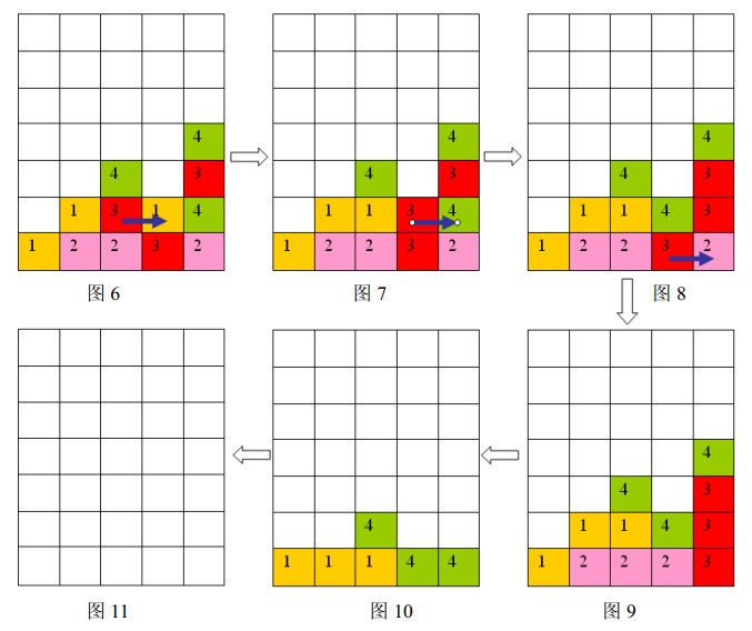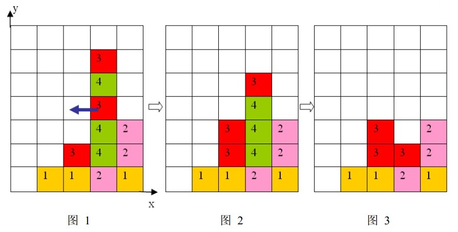 1. 每步移动可以且仅可以沿横向(即向左或向右)拖动某一方块一格:当拖动这一方块时,如果拖动后到达的位置(以下称目标位置)也有方块,那么这两个方块将交换位置(参见输入输出样例说明中的图6到图7);如果目标位置上没有方块,那么被拖动的方块将从原来的竖列中抽出,并从目标位置上掉落(直到不悬空,参见下面图1和图2);