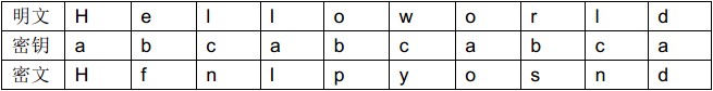 例如,明文M=Helloworld,密钥k=abc时,密文C=Hfnlpyosnd。
