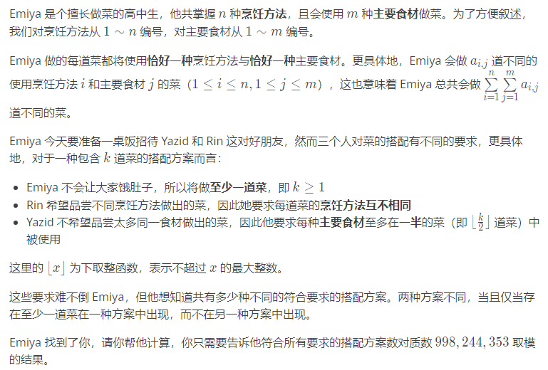 对于所有测试点,保证 1 \leq n \leq 1001≤n≤100,1 \leq m \leq 20001≤m≤2000,0 \leq a_{i,j} \lt 998,244,3530≤ai,j<998,244,353。