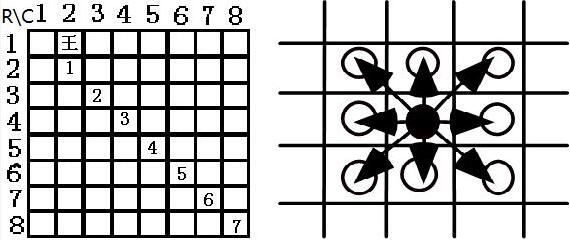 样例中国王(上图中用“王”表示)初始时在棋盘上的第 1 行第 2 列,要走到棋盘右下角的方格即第 8 行第 8 列,小 T 只要第一步将国王向下移一格走到第 2 行第 2 列,然后一 直沿斜线向右下方向连续走 6 步即可到达目标位置,图中将国王走过的位置用 1~7 依次 标出来了,总共需要走 7 步,可以验证其它走法都不可能少于 7 步。